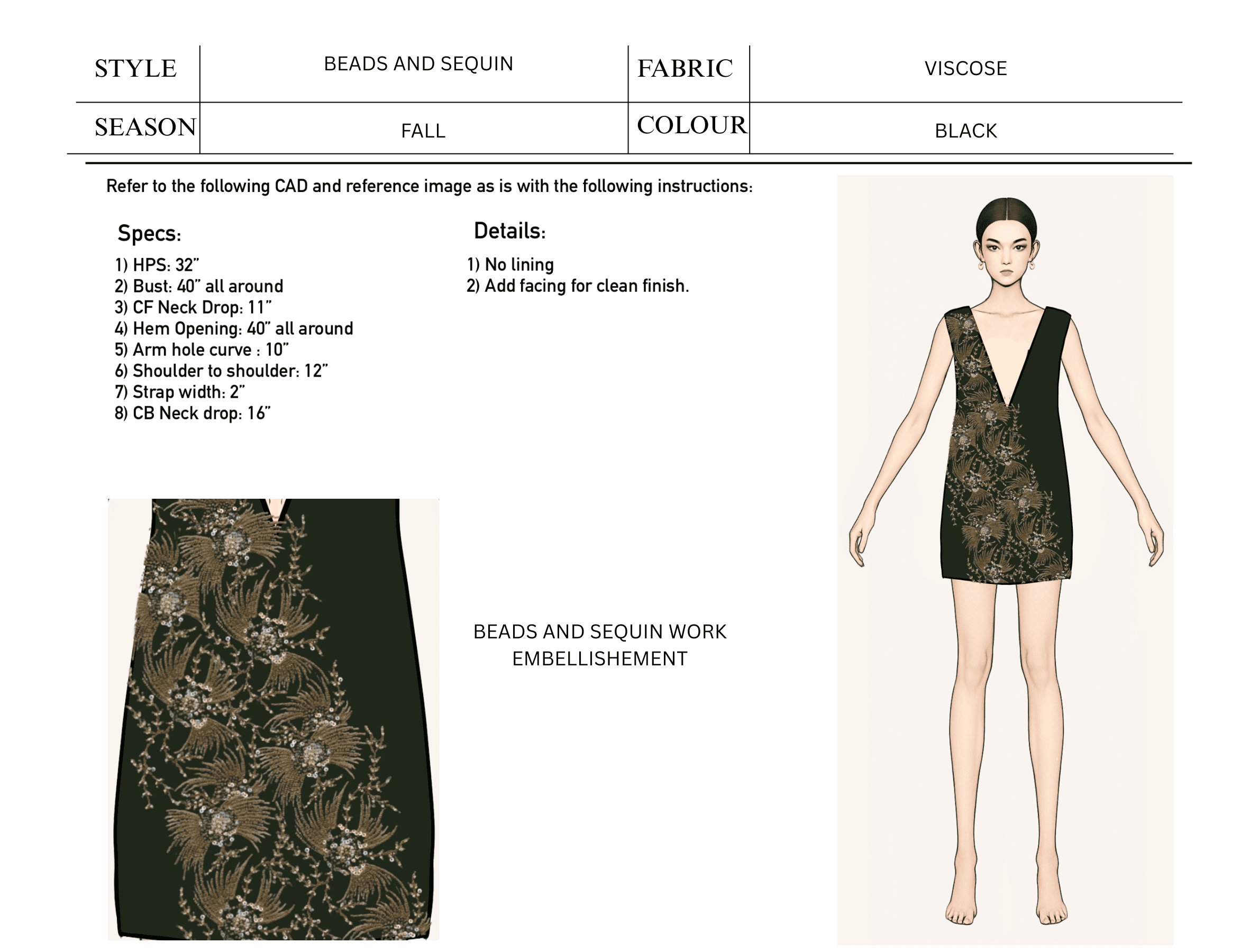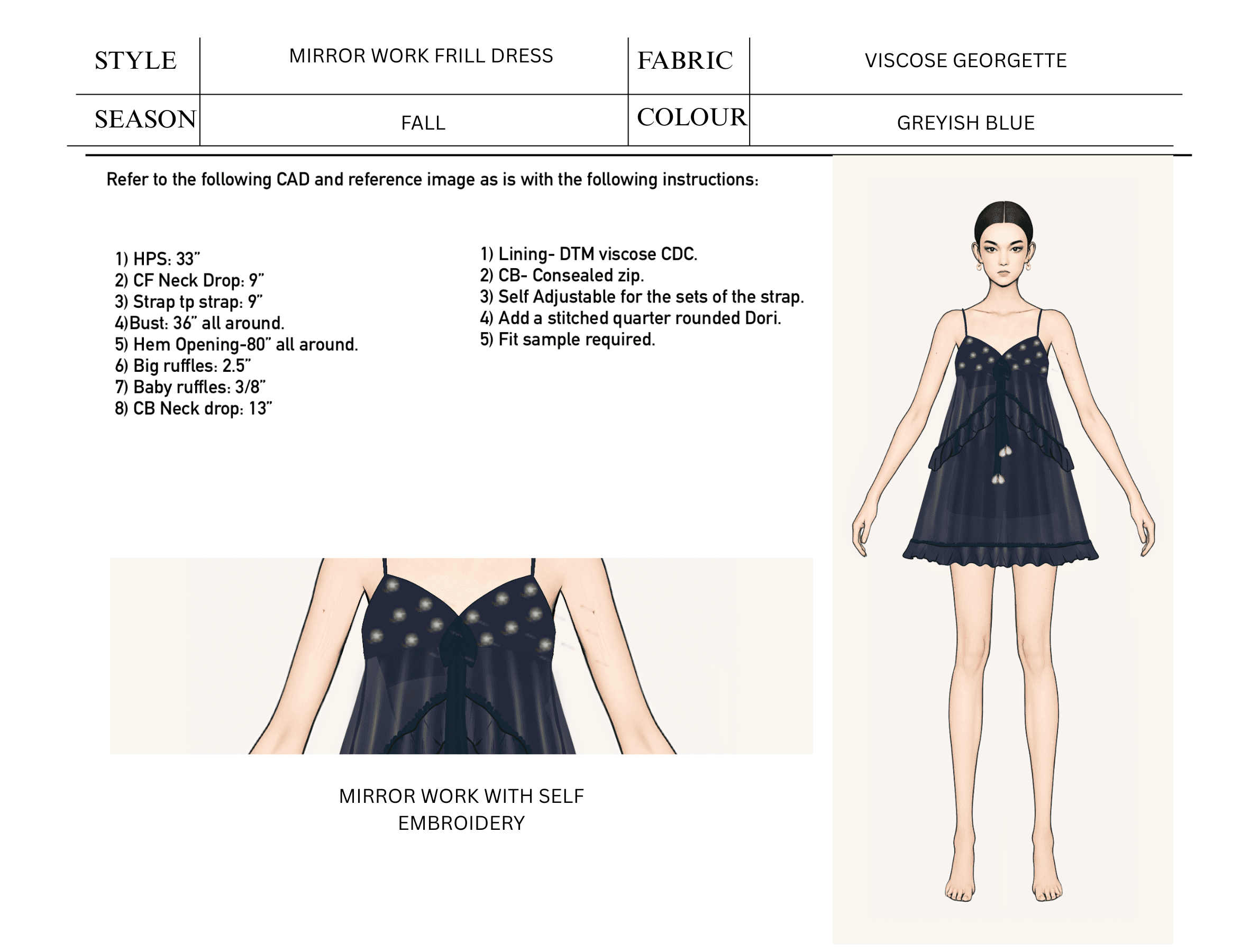 The document also lists all materials required, including fabric types, fabric weights, color codes, trims, zippers, buttons, elastic, and thread colors. Construction details, such as stitch types, seam finishes, hem styles, and reinforcements, are specified to ensure the garment is assembled correctly. Label and tag placements, including brand labels, care labels, and size tags, are also indicated with exact positions.
